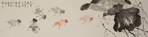 中国书画见仁见智,深浅不一的墨色透出的是一种文化、一种情感。关东一笔鱼齐根石老师素喜画鱼,深知国画精华,寥寥勾勒,起承转合,正所谓是锦鲤鱼跃似是画外景,花下金鱼分外眼前来。国学专家龚心甫金鱼作品,形神兼备,古朴淡雅,天然纯真,章法考究,清逸简洁,作品贯穿古今,别开生面,是前无古人,后未见来者。